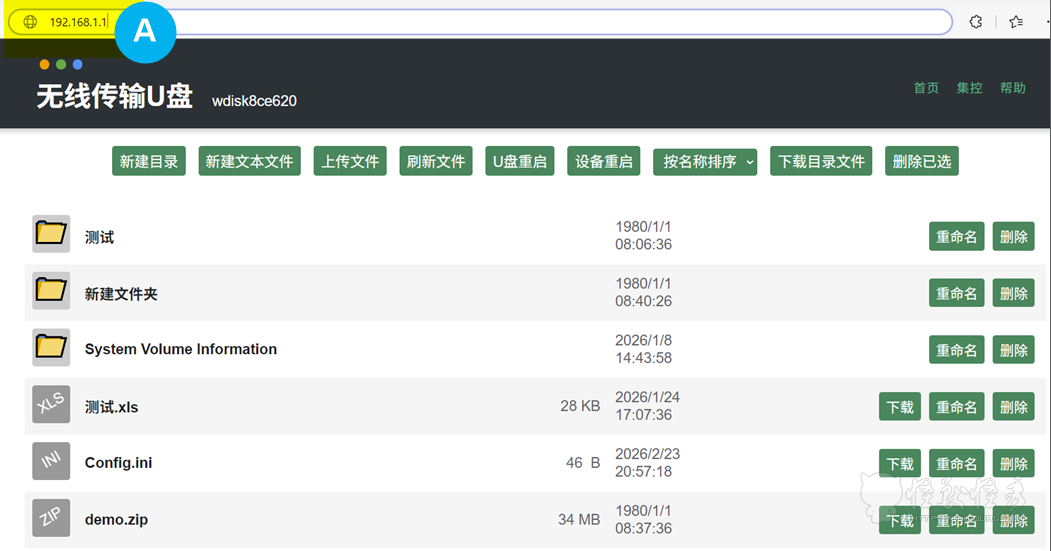 将无线U盘的IP地址填入浏览器地址栏(上图A处)后回车,通过网页便可以管理U盘内的文件。