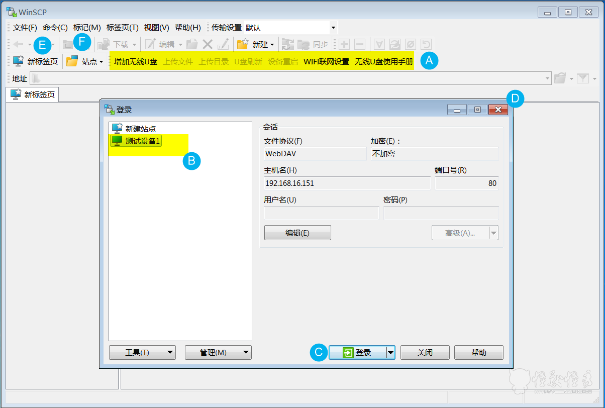 B. 选择显示对应的无线U盘点击C处按钮登录后就可以显示并修改对应的无线U盘的文件