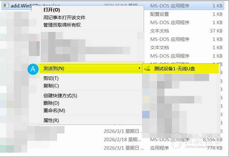 在要传输的文件单击右键-发送到-点击对应的无线传输U盘名称后文件便会发送到该无线传输U盘。(如下图)